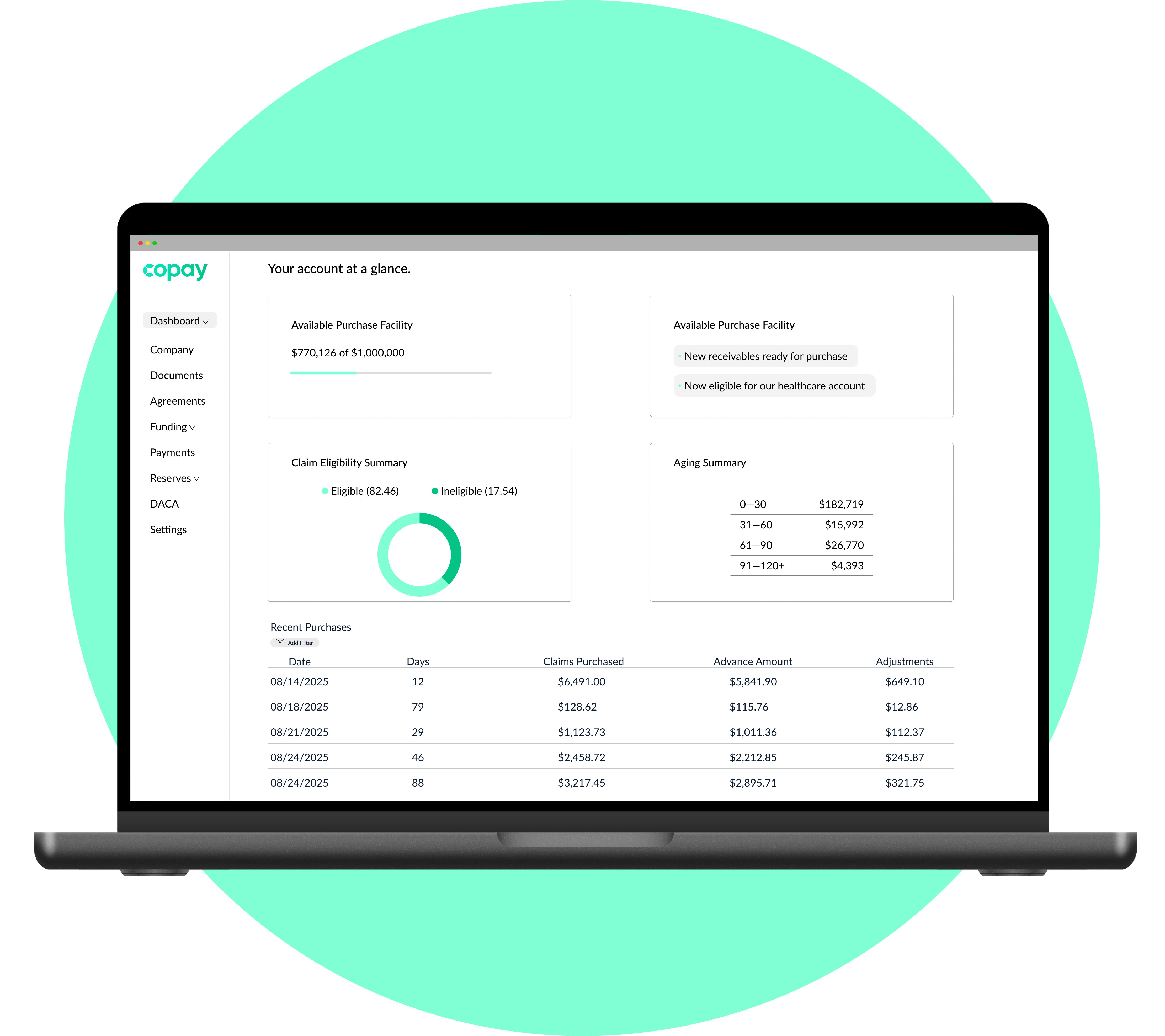 Copay connects directly to your EHR, advancing on all your eligible claims in just hours. You stay in control, and once payors pay, we handle reconciliation automatically.